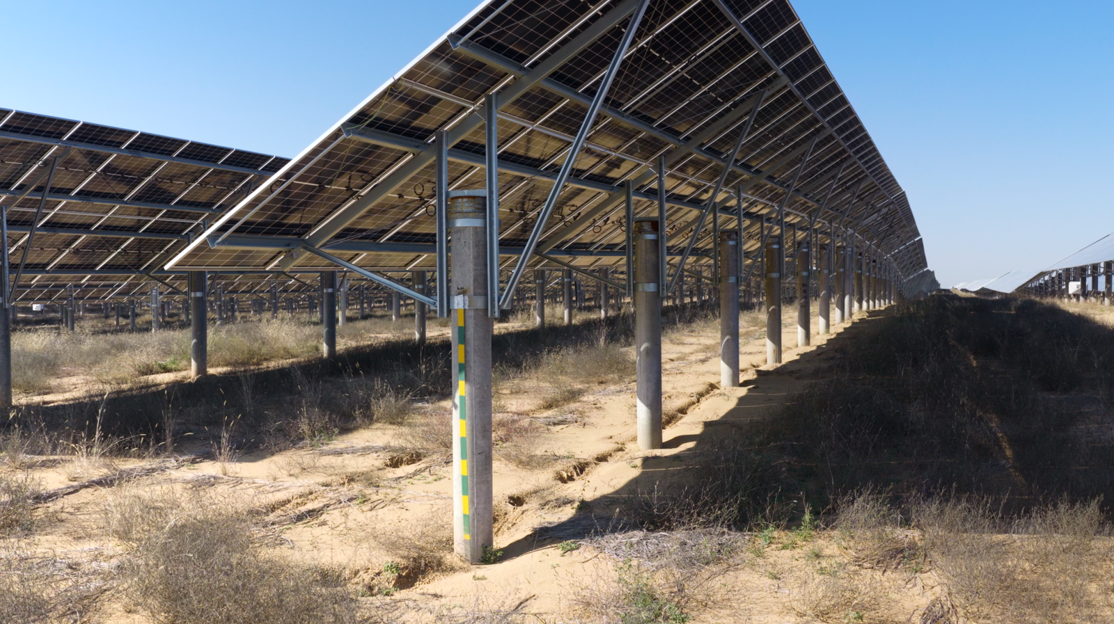 • Scientifically selected tilt angle: Modules are installed at a 31° fixed tilt angle, maximizing solar energy capture. At the same time, the resulting shading effect reduces surface moisture evaporation, improves the microclimate beneath the array, and promotes vegetation growth and ecological recovery.